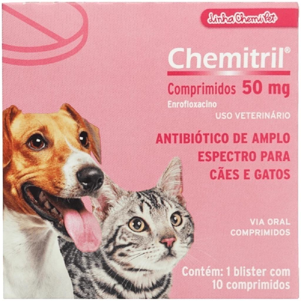 Cada comprimido de Chemitril contém 50 mg de Enrofloxacino e excipientes que garantem a qualidade e eficácia do medicamento.