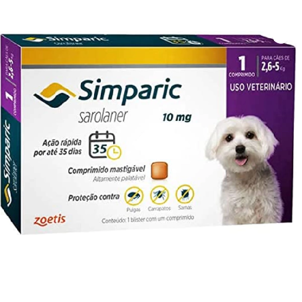 O carrapaticida Simparic é uma solução confiável para o tratamento e prevenção de infestações por pulgas e carrapatos em cães de pequeno porte com peso entre 2,6 e 5 kg. Oferece eficácia e proteção prolongada para manter seu pet saudável e confortável.