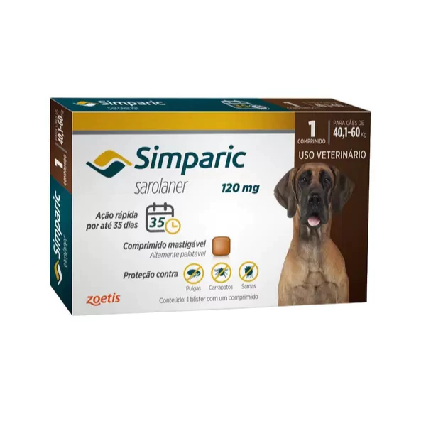 Simparic 120 mg é a solução ideal para proteger cães de grande porte, com peso entre 40 e 60 kg, contra pulgas, carrapatos e sarnas. Sua fórmula de alta eficácia elimina os parasitas, prevenindo infestações futuras e protegendo o ambiente da reprodução de ovos.