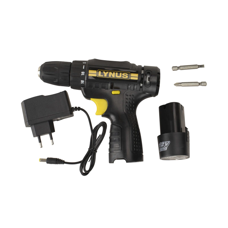 A Parafusadeira/Furadeira Lynus é uma ferramenta versátil e prática, ideal para trabalhos em metal e madeira. Com um design sem fio e bateria de 12V, oferece liberdade e eficiência. Inclui um carregador bivolt, uma bateria de íons de lítio e dois bits.