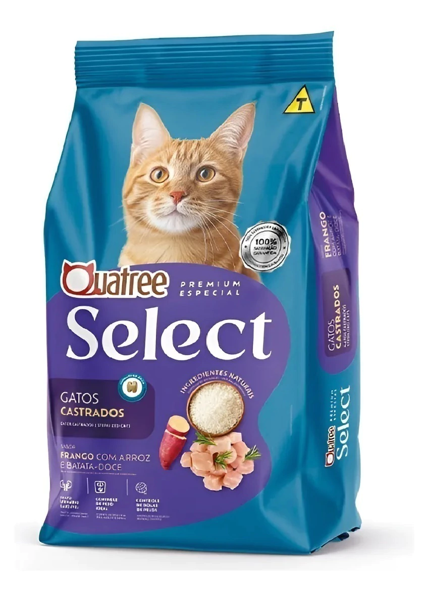 A Ração para Gatos Castrados Quatree Select Frango foi desenvolvida especialmente para gatos que passaram pelo processo de castração. Sua fórmula contém ingredientes selecionados que fornecem os nutrientes necessários para uma dieta equilibrada. Com proteínas de alto valor biológico e carboidratos de fácil digestão, essa ração auxilia na manutenção do peso ideal, na saúde urinária e no equilíbrio nutricional do seu gato castrado.