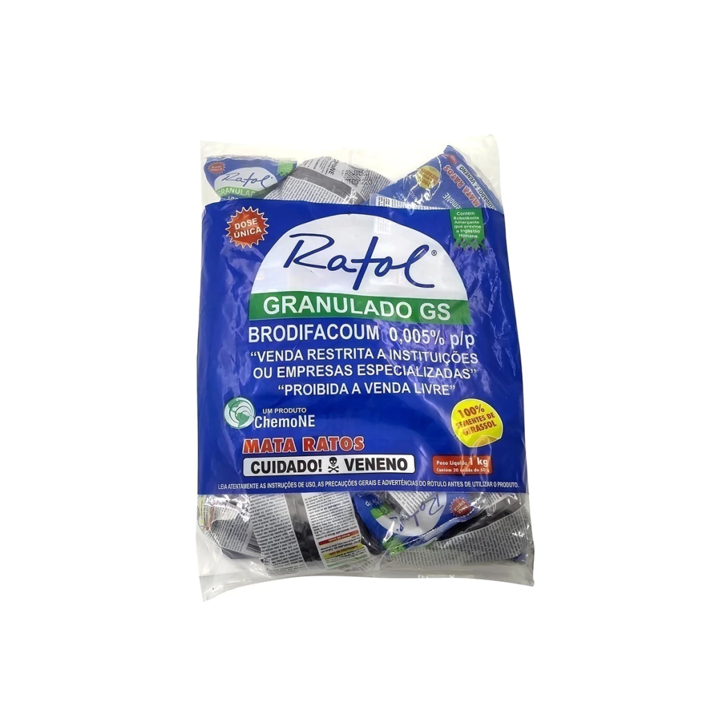 O raticida Ratol Girassol em sachê de 50 gramas é uma solução prática e eficiente para o controle de roedores como ratos, ratazanas e camundongos. Sua fórmula contém brodifacoum e é composta por cem por cento de sementes de girassol, oferecendo alta atratividade e resultado com dose única. Pode ser utilizado em áreas internas e externas, sendo ideal para ambientes residenciais, comerciais, rurais e industriais.