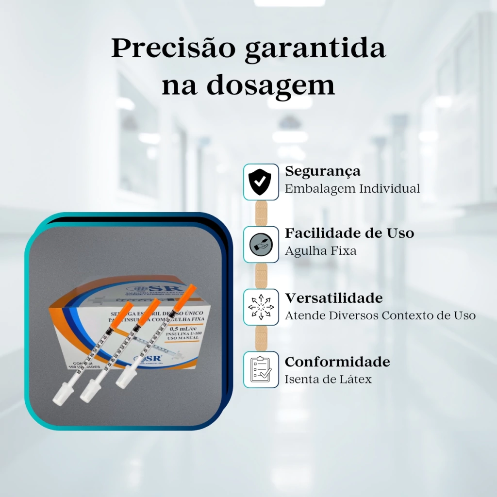 Seringa de insulina Luer descartável de 0,5 mL com agulha hipodérmica 30G (6 mm x 0,25 mm), agulha fixa (não removível) e ZERO espaço residual. Escala de alta nitidez com subdivisão de 0,01 mL (50 traços de 1 UI). Agulha tri-facetada, ultra fina e siliconizada para deslizamento suave. Lubrificação interna e trava para controle de deslizamento. Embalagem individual e estéril. Fabricada em ambiente 100% controlado conforme BPF. Conformidade com INMETRO e registro ANVISA: 80026180015.